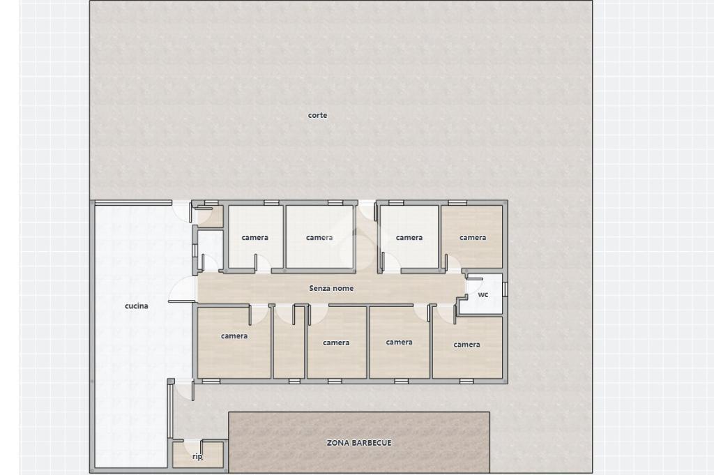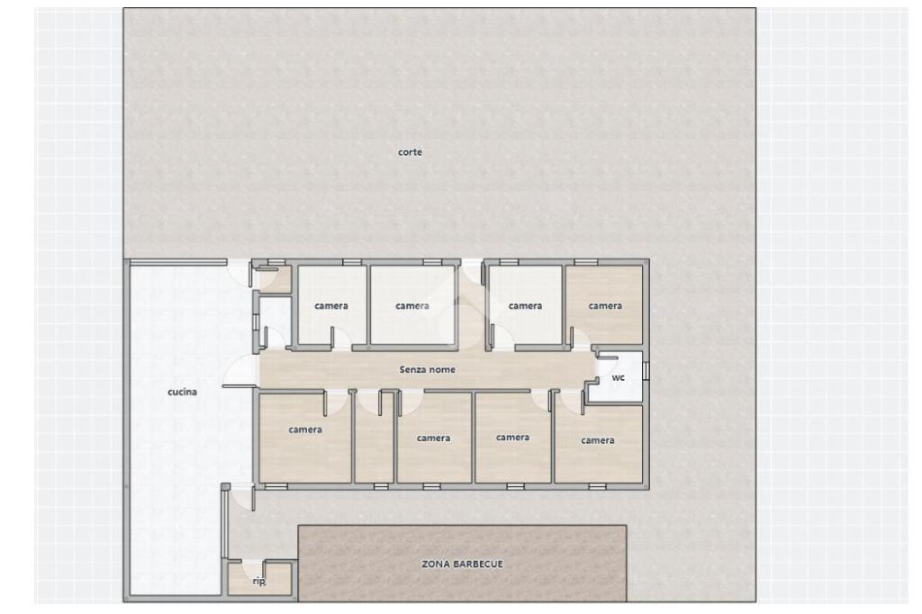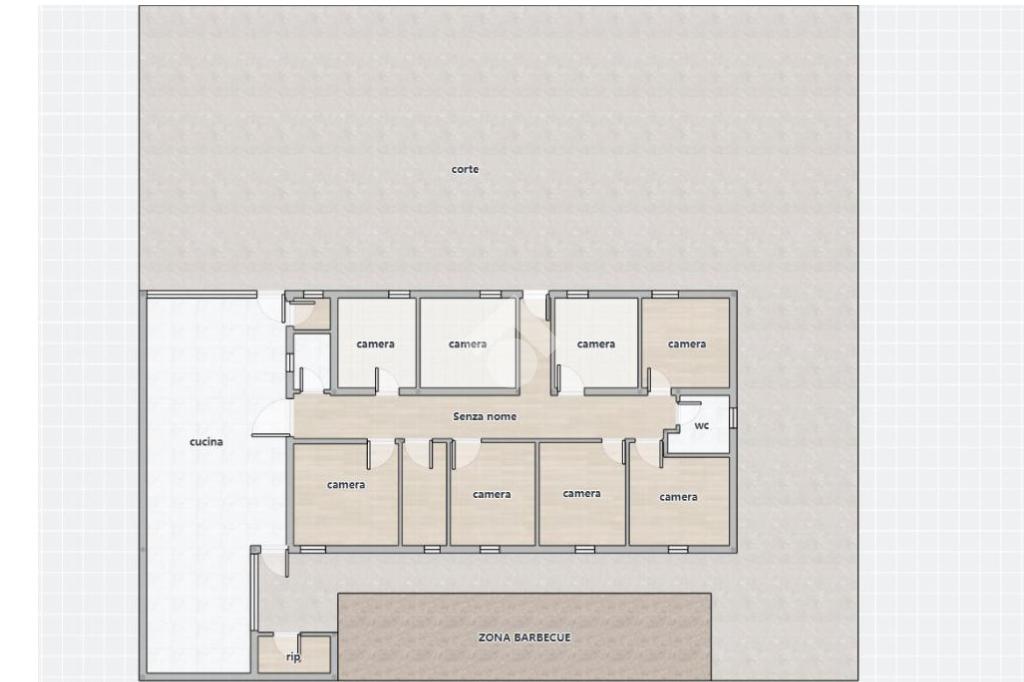 La villa è sviluppata interamente su un unico livello al piano terra ed è situata su un lotto di circa 600 metri quadrati circa. L'interno si compone da cucina-soggiorno, tre camere da letto, tre camerette, tre bagni e due ripostigli